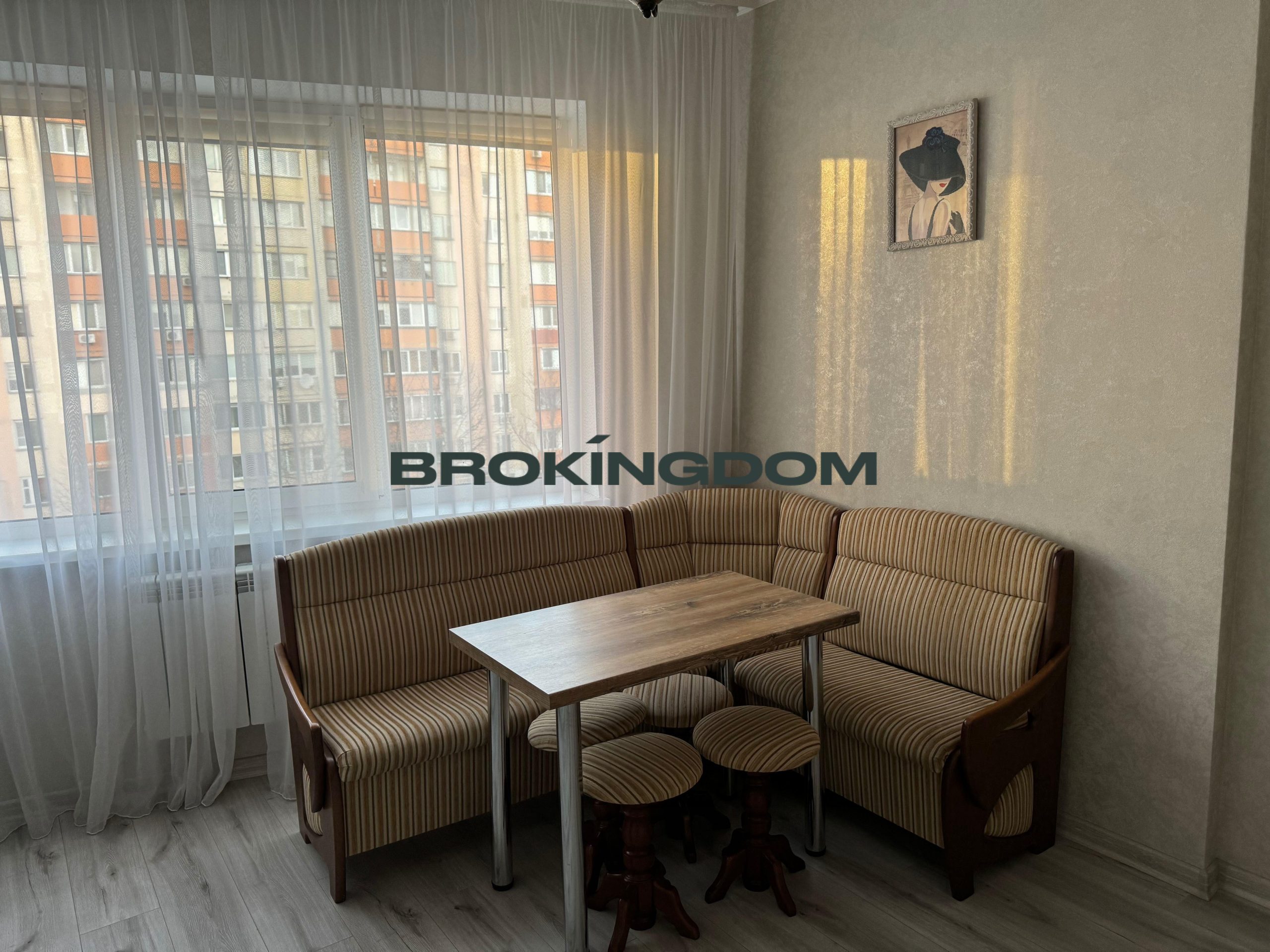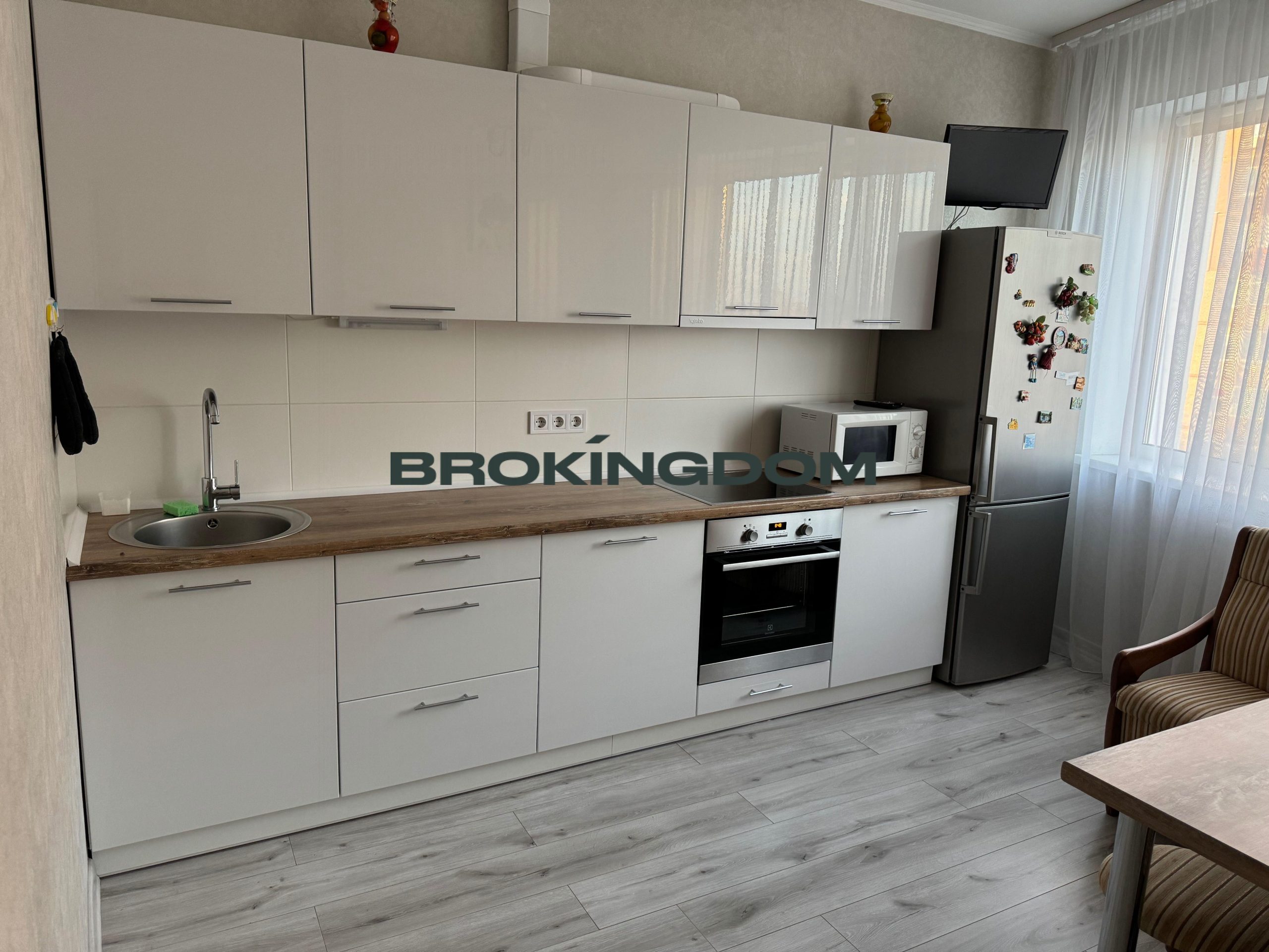 Кухня з вбудованою технікою; меблі та техніка залишаються новому власнику.