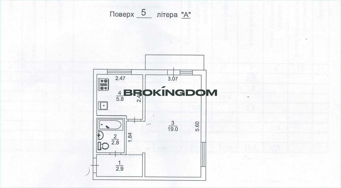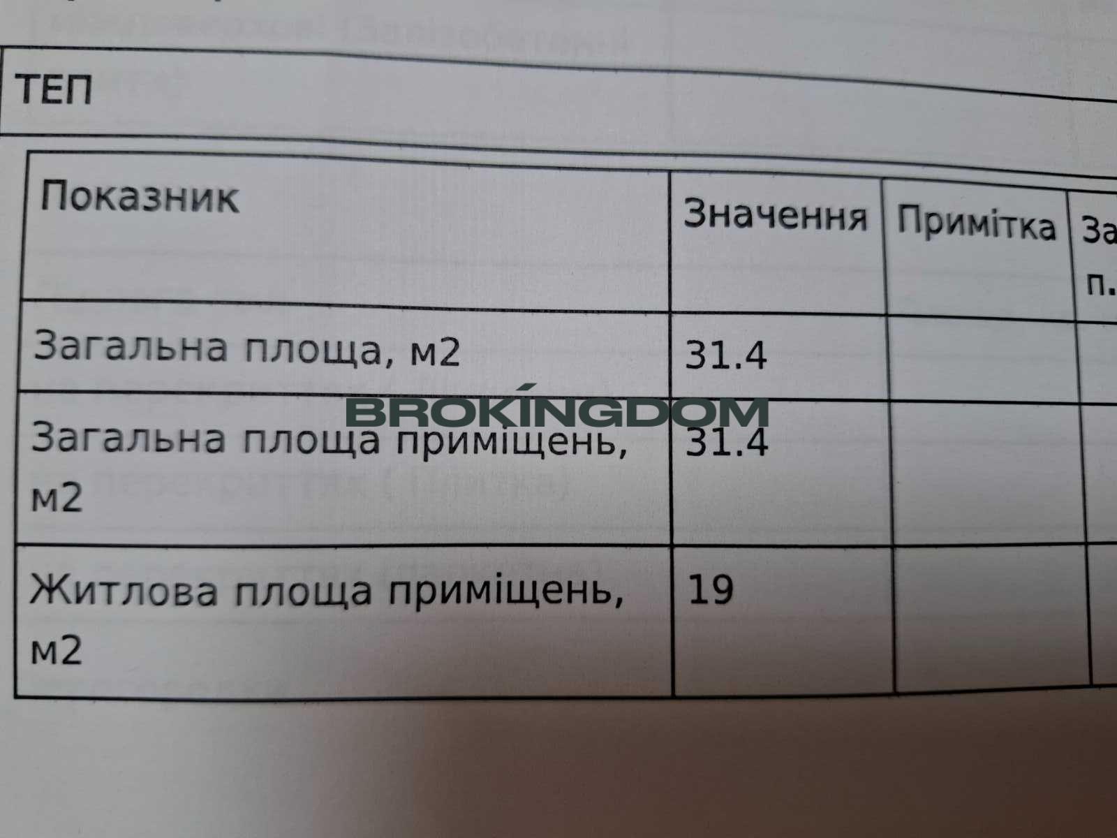 Загальна площа – 31, 4 кв.м. Житлова площа – 19 м2. Кухня – 5.8 м2.