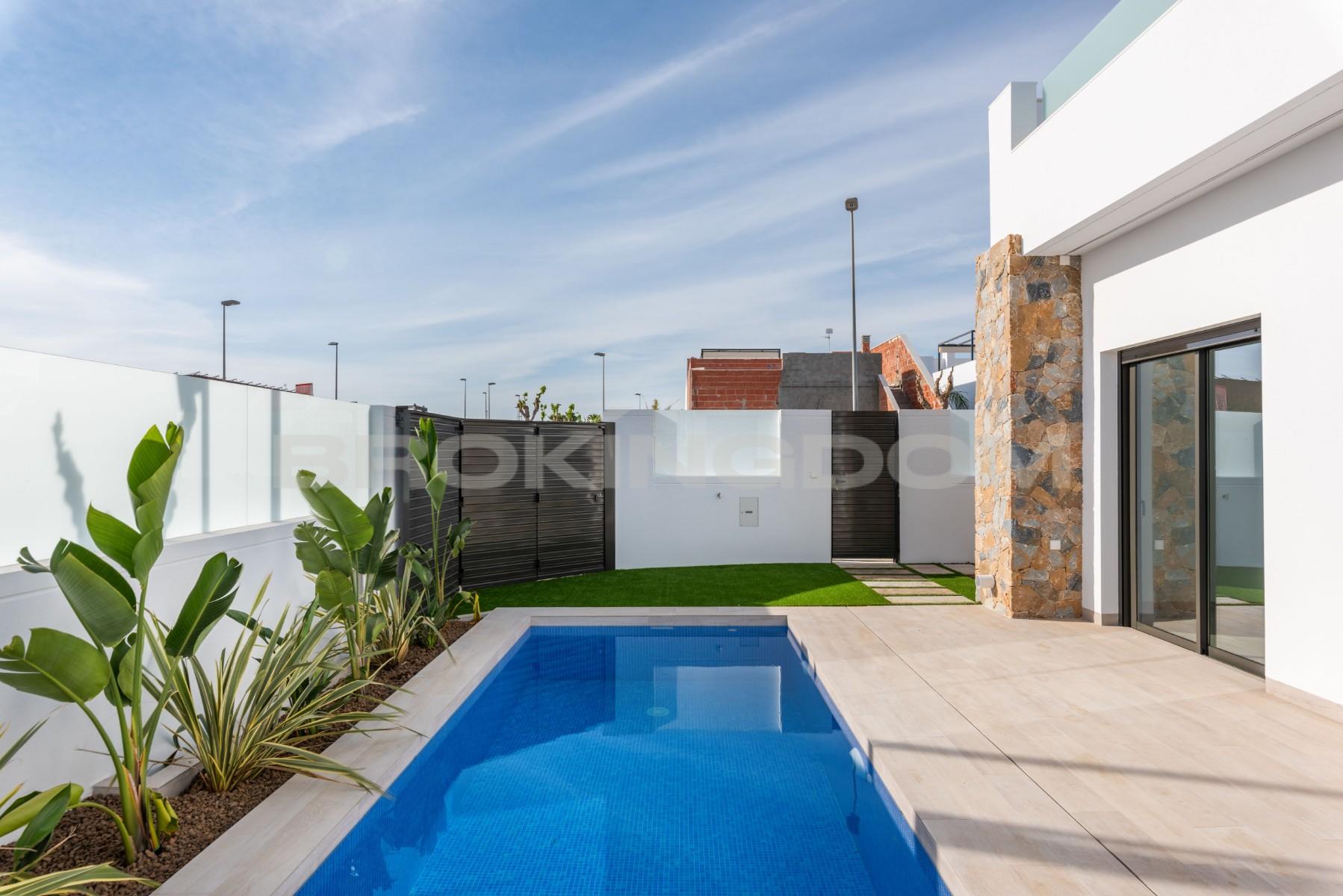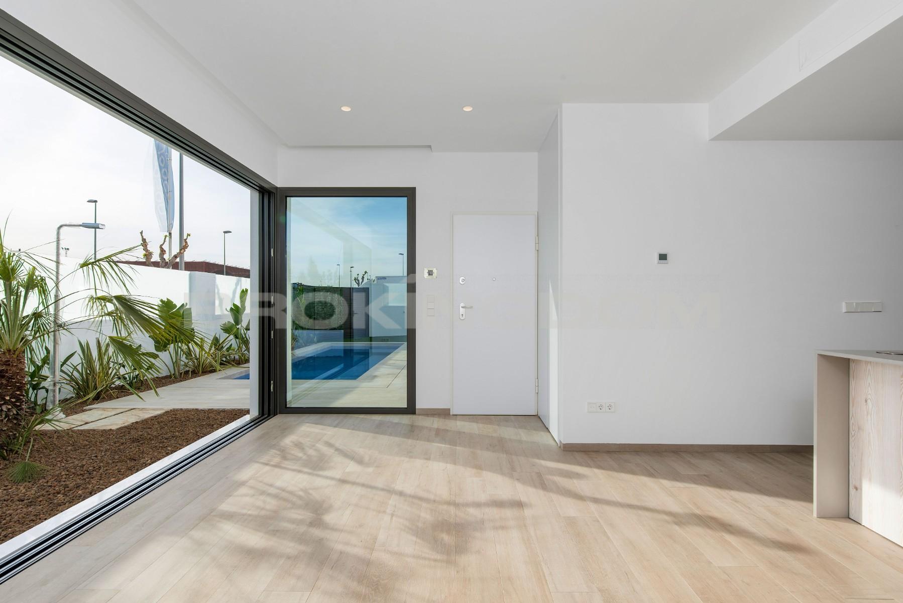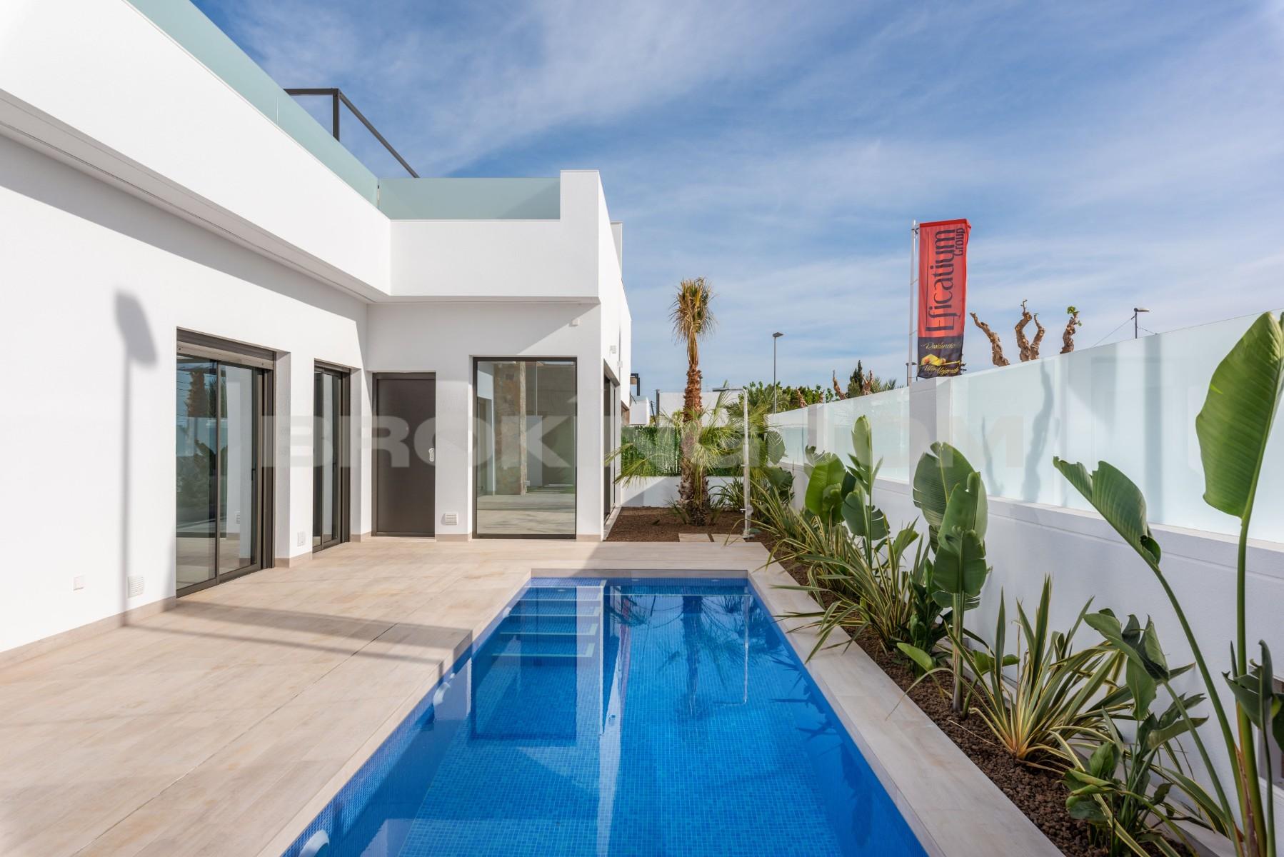 This luxury villa is finished and ready to move into and includes all furniture, hot/ cold air conditioning, LED lighting, landscaped garden with private pool and modern kitchen with fitted appliances.This luxuryvilla is built all on one level and consists of a lounge/diner with patio doors leading out into the garden and terrace with a private swimming pool, an open plan modern kitchen with fitted appliances including oven, hob, extractor, fridge/freezer and microwave.There is a master bedroom with fitted wardrobes, en suite bathroom with access to an internal patio, another double bedroom with fitted wardrobes and a guest bathroom. There is a staircase which leads up to a huge 80 m² private rooftop solarium.Each villa includes private swimming pool, finished garden with irrigation system, complete bathrooms with shower screens, kitchen appliances, rooftop solarium and LED lighting throughout the house.The Pilar de la Horadada area is a well established Spanish town and has a great selection of shops, bars and restaurants. It is situated only a few kilometres to the beautiful beaches of Torre de la Horadada which has a lovely marina and promenade to enjoy a glass of wine in the sun by the beach. The development is only a few kilometres away from the Lo Romero golf resort.