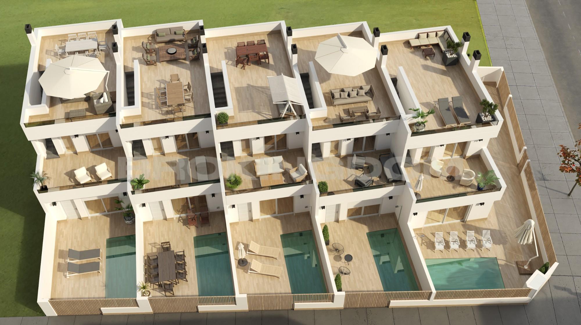 These 3 bedroom, 2 bathroom villas come complete with private pool, first floor terrace, fully installedvented air conditioning, rooftop solarium, modern kitchen with fitted appliances and LED lighting.